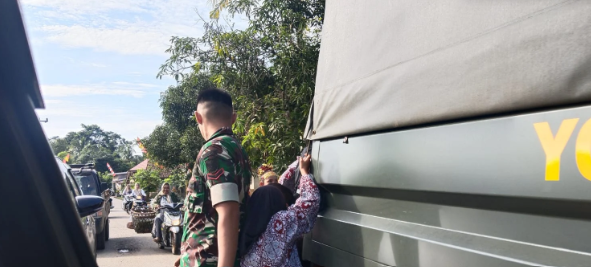 Saat kerumunan itu, terdengar suara lucu dari salah satu anak yang berkata, “Abang maaf aku kejepit,” yang segera menimbulkan tawa di antara pengunjung. Ungkapan ini menunjukkan bahwa anak-anak sangat ingin terlibat dan dekat dengan anggota Satgas TMMD.