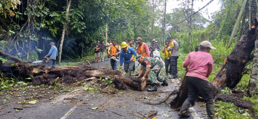 Bangli – Pada Selasa (10/2/2026), Babinsa Desa Bayung Gede, Kopka Nyoman Purnawirawan dari Koramil 1626-04/Kintamani, melakukan tindakan cepat untuk menanggulangi pohon tumbang yang menghalangi akses Jalan Raya Desa Bayung Gede menuju Payangan. Kejadian ini dipicu oleh hujan deras yang berlangsung sejak pukul 05.00 WITA, yang mengakibatkan melonggar tanah dan tumbangnya pohon jenis Enau/Aren yang menimpa kabel listrik.