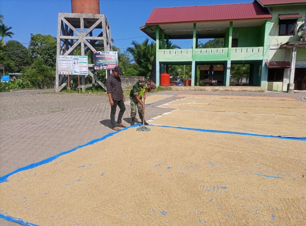 ACEH JAYA – Kebersamaan antara TNI dan masyarakat kembali terlihat di Desa Lhuet, Kecamatan Jaya. Babinsa Koramil 01/Jaya Kodim 0114/Aceh Jaya, Koptu Aris Kartiko, membantu warga binaannya, Pak Sayed, menjemur padi hasil panen, Sabtu (28/02/2026).