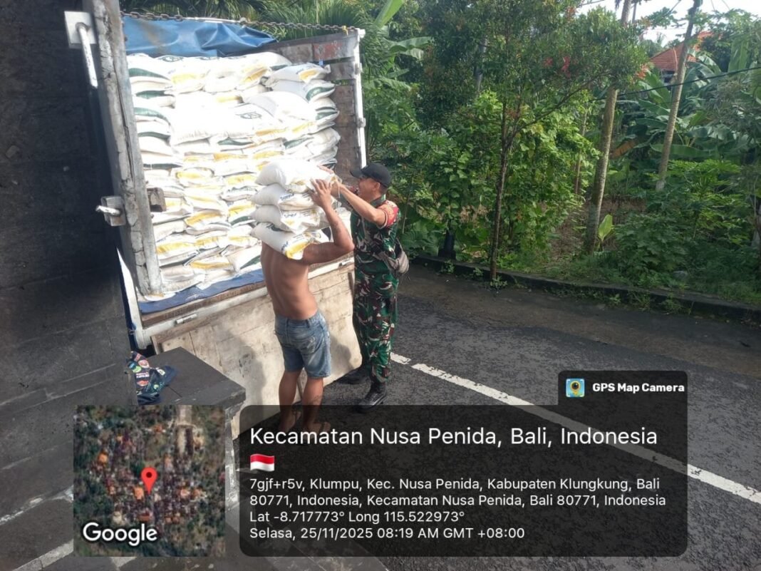 Klungkung,- Bertempat di Kantor Desa Klumpu, Kecamatan Nusa Penida, Kabupaten Klungkung, babinsa Klumpu Kopka Kadek Parta melaksanakan monitoring droping bantuan pangan beras dan minyak goreng program Penerima Bantuan Pangan ( PBP ) periode bulan Oktober dan Nopember 2025, Selasa ( 25/11/25 ).