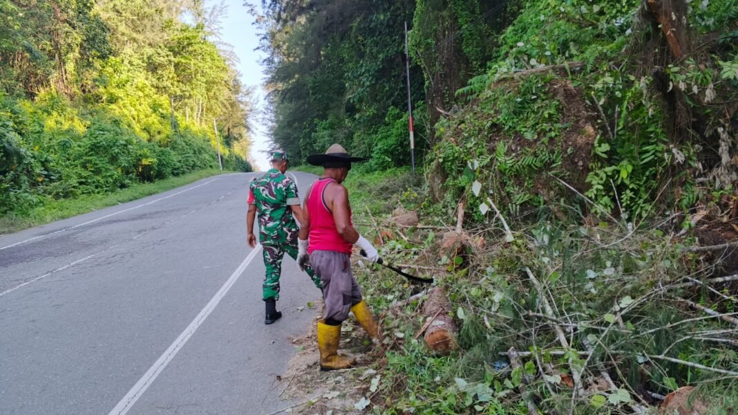 ACEH JAYA – Mengantisipasi potensi bencana alam pada musim penghujan, Babinsa Koramil 03/Setia Bakti Kodim 0114/Aceh Jaya, Kopda Gito, melaksanakan patroli di wilayah yang rawan terjadi longsor di kawasan Gunung Cincrang, tepatnya di jalur nasional Banda Aceh – Meulaboh, Desa Sawang, Kecamatan Setia Bakti, Kabupaten Aceh Jaya, Rabu (22/04/2026).