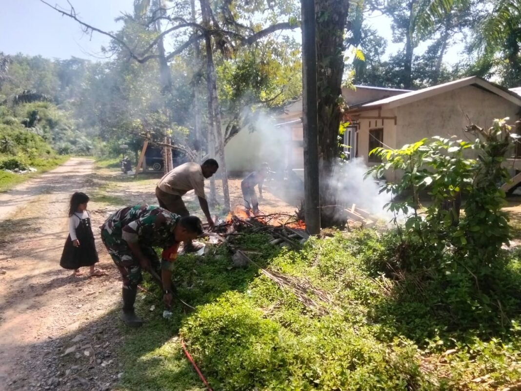 ACEH JAYA – Suasana gotong royong terlihat di Desa Bate Meutudong, Kecamatan Panga, Sabtu (07/03/2026), saat Babinsa Koramil 05/Panga Kodim 0114/Aceh Jaya, Sertu Astrada Beruh, bersama warga membersihkan sampah non-organik di sepanjang jalan menuju meunasah.