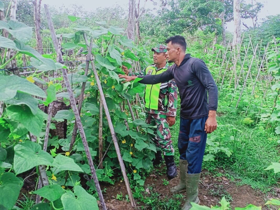 Salah satu wujud nyata dari kegiatan tersebut terlihat saat Babinsa bersama petani melakukan pengecekan perkembangan tanaman timun di lahan pertanian.