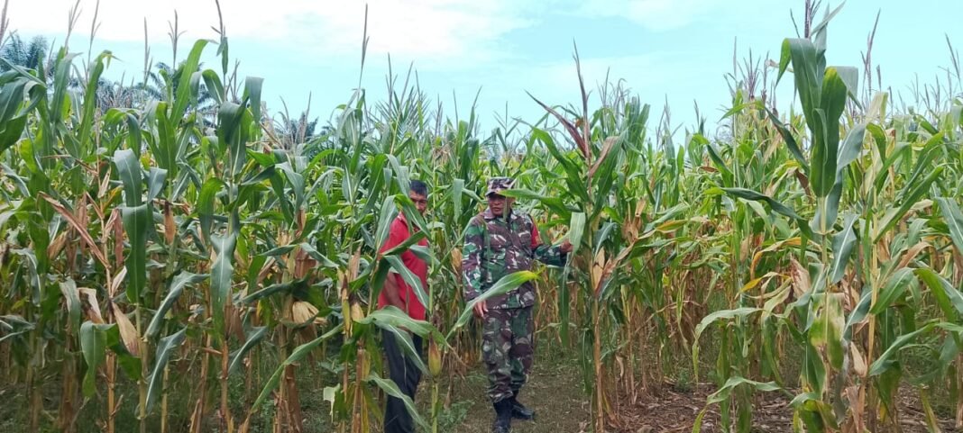 ACEH JAYA – Babinsa Posramil Pasie Raya Kodim 0114/Aceh Jaya, Sertu T. Herman, melakukan pengecekan tanaman jagung milik anggota Kelompok Tani Sare Meurata di Desa Krueng Beukah, Kecamatan Pasie Raya, Kabupaten Aceh Jaya, Rabu (11/03/2026).