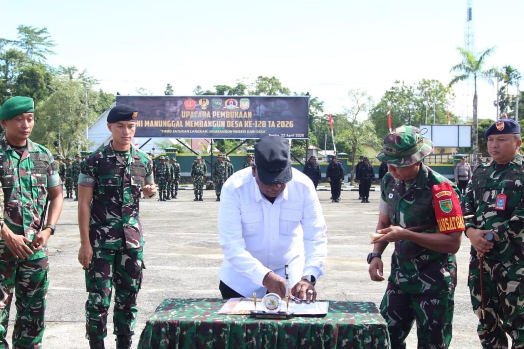Timika – Pada Rabu, 22 April 2026, di Makodim 1710/Mimika, berlangsung penandatanganan naskah program TNI Manunggal Membangun Desa (TMMD) Ke-128 Tahun Anggaran 2026. Acara ini dilaksanakan dalam upacara pembukaan yang dihadiri oleh sejumlah pejabat TNI, Polri, serta perwakilan pemerintah daerah dan masyarakat setempat.