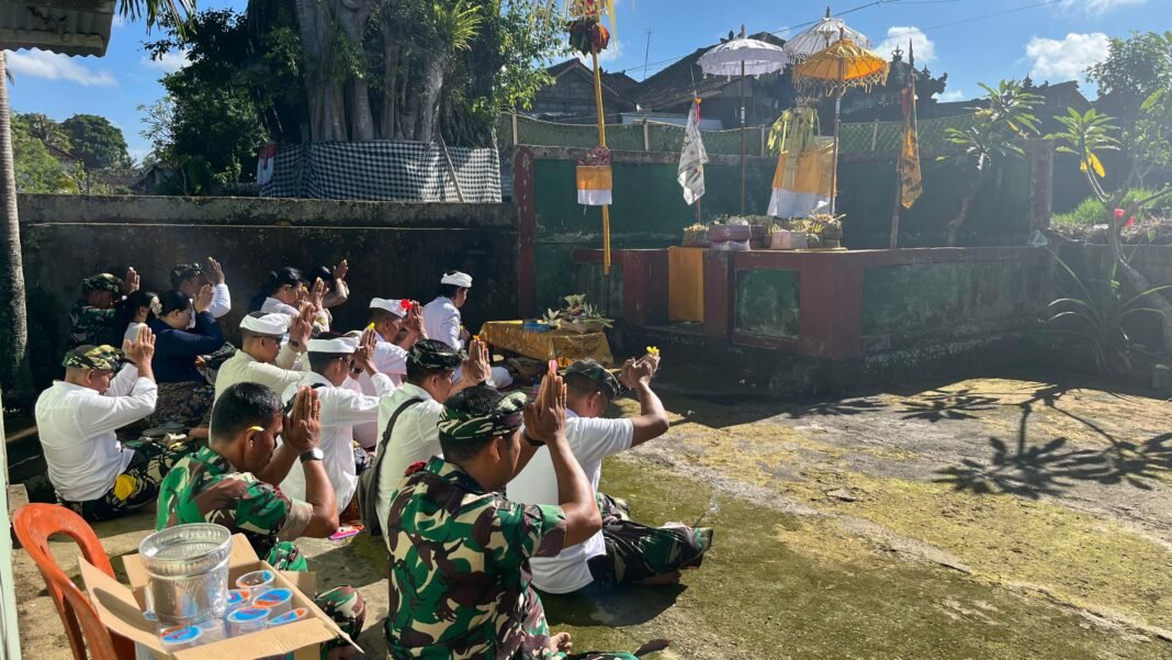 Bangli – Dalam rangka merayakan Upacara Piodalan yang bertepatan dengan Purnama Kedasa, Danramil 1626-01/Bangli, Kapten Cke I Komang Gita, bersama anggota dan keluarga besar Koramil 1626-01/Bangli, melaksanakan persembahyangan bersama di Padmasana Koramil 1626-01/Bangli, yang terletak di Kelurahan Bebalang, Kecamatan/Kabupaten Bangli pada Kamis (2/4/26).