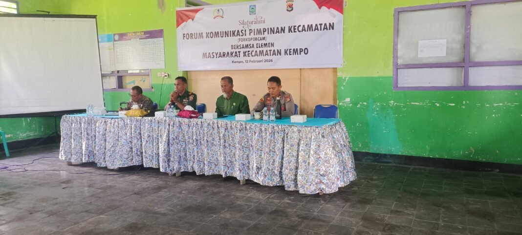 Kempo – Komandan Koramil 1614-02/Kempo, Kapten Czi Arif Budimansyah, turut serta dalam rapat koordinasi lintas sektoral Forum Komunikasi Pimpinan Kecamatan (Forkopimcam) yang berlangsung di Aula Kecamatan pada 12 Februari 2026. Dalam kesempatan tersebut, Danramil menekankan pentingnya kolaborasi antara 3 Pilar Kecamatan untuk menjaga keamanan dan ketertiban masyarakat (kamtibmas) di wilayah setempat, khususnya di setiap desa di Kecamatan Kempo.