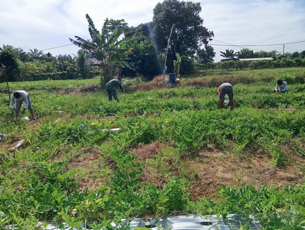 Aceh Barat – Sulur-sulur tanaman semangka merambat rapi di lahan pertanian Desa Pasi Aceh, Kecamatan Woyla. Di sela-sela tanaman itu, Personel Satgas TMMD Reguler ke-127 Kodim 0105/Abar bersama warga terlihat sibuk melakukan pemangkasan tunas atau pruning guna meningkatkan kualitas pertumbuhan buah, Minggu (8/3/2026).