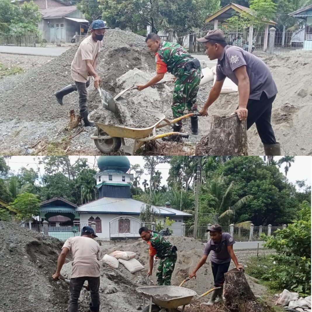 Kegiatan gotong royong tersebut dilakukan bersama masyarakat setempat dengan penuh semangat dan kebersamaan. Babinsa bersama warga bahu-membahu mengangkat material bangunan, mencampur semen, menyusun batu pondasi, hingga memastikan proses pembangunan berjalan dengan baik. Kehadiran Babinsa di tengah masyarakat menjadi bukti nyata bahwa TNI selalu hadir untuk membantu mengatasi kesulitan rakyat di sekelilingnya.