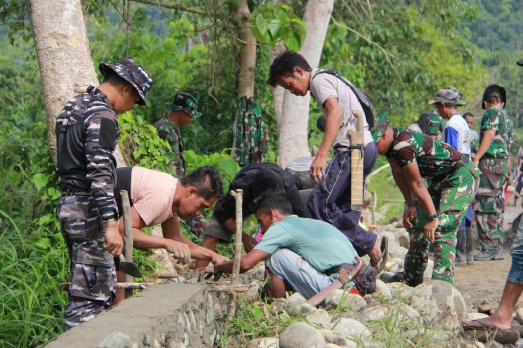 Personel Satgas TMMD bersama masyarakat terlihat bahu-membahu dalam proses pekerjaan. Mereka mengangkut material hingga meratakan badan jalan secara gotong royong, mencerminkan sinergi yang erat antara TNI dan warga setempat.