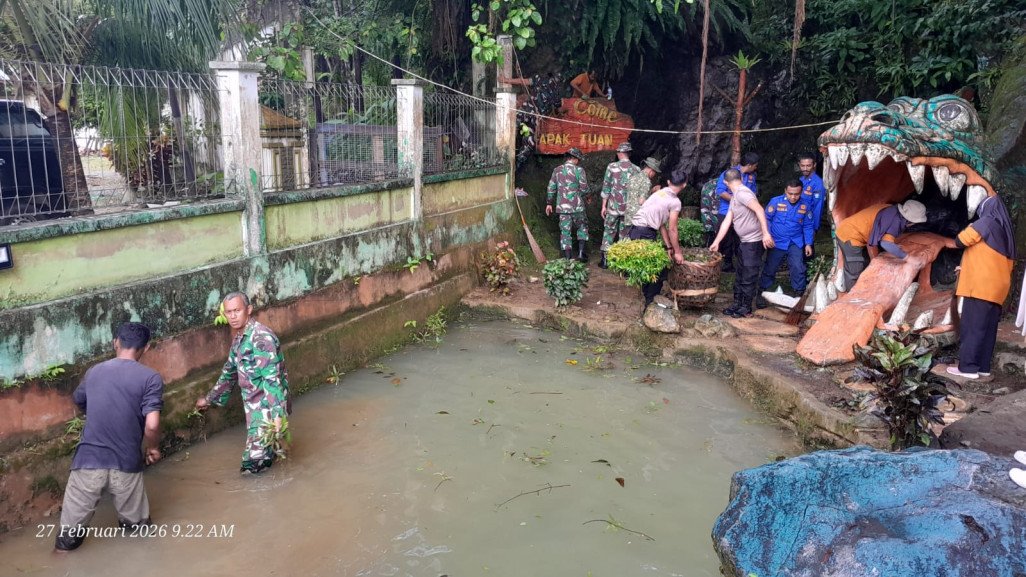Aceh Selatan – Personel TNI bersama instansi terkait melaksanakan kegiatan gotong royong pembersihan Taman Kota Tapaktuan yang berlokasi di kawasan Patung Naga Tapaktuan, Kabupaten Aceh Selatan, Jumat (27/2/2026).