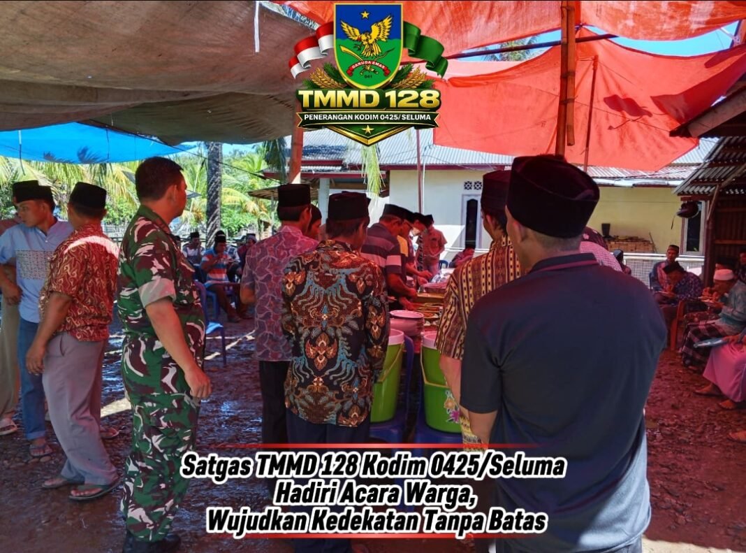 Seluma – Kehadiran Satuan Tugas (Satgas) TNI Manunggal Membangun Desa (TMMD) ke-128 Kodim 0425/Seluma di tengah masyarakat tidak hanya terfokus pada pembangunan fisik semata, tetapi juga aktif menjalin kedekatan sosial dengan warga. Salah satu bentuk nyata kebersamaan tersebut terlihat saat personel Satgas memenuhi undangan acara sosial di rumah warga Desa Lubuk Lagan.