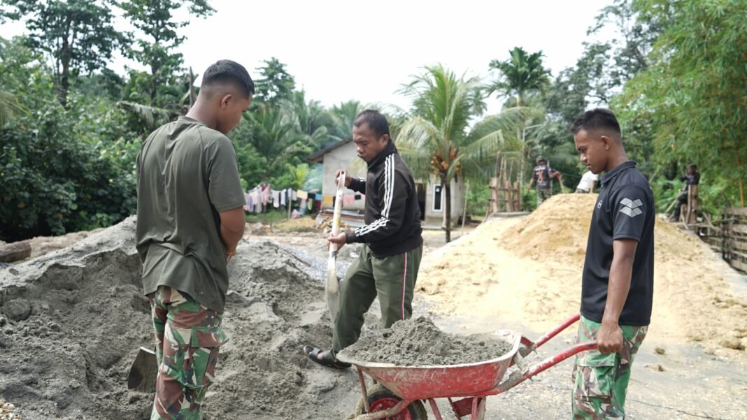 KENDARI – Semangat pantang menyerah terpancar dari anggota Satgas TMMD ke-127 Kodim 1417/Kendari saat bersama-sama dengan warga mengangkut material bangunan dengan menggunakan gerobak dorong di lokasi proyek pembangunan, pada Kamis (5/3). Keterbatasan akses jalan mengharuskan mereka melakukan pengangkutan secara manual. Namun, kondisi ini justru menunjukkan kuatnya sinergi antara TNI dan masyarakat.