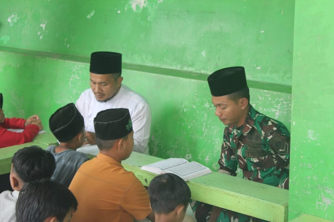 Dengan penuh kesabaran, Serda Khairul M duduk bersila di antara para santri, membimbing mereka dalam melafalkan huruf-huruf hijaiyah. Suasana pembelajaran yang akrab dan hangat jelas terasa, apalagi menjelang datangnya bulan suci Ramadhan, yang semakin menambah semangat para santri.