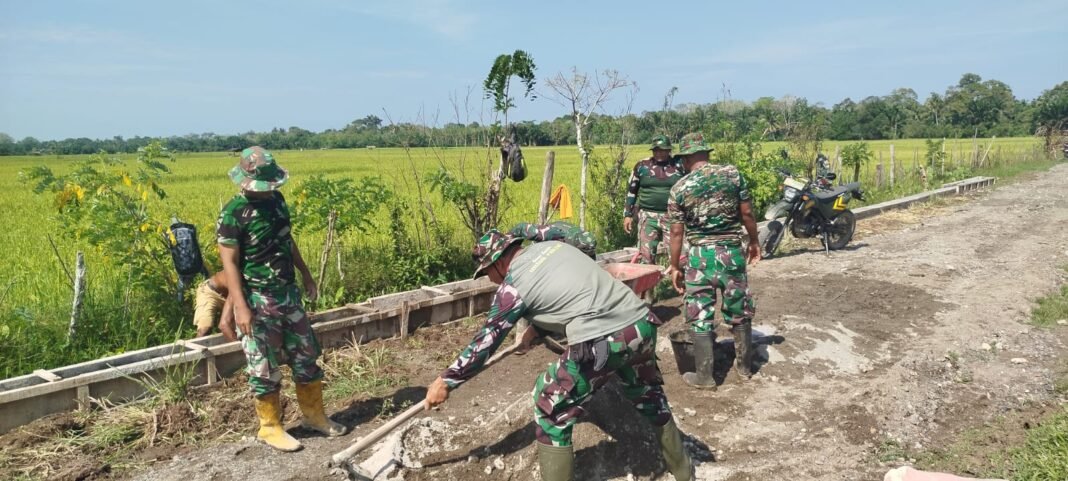 Aceh Barat – Semangat pengabdian para prajurit Satgas TMMD Reguler ke-127 Kodim 0105/Abar terus terlihat dalam setiap kegiatan pembangunan di Desa Pasi Aceh.