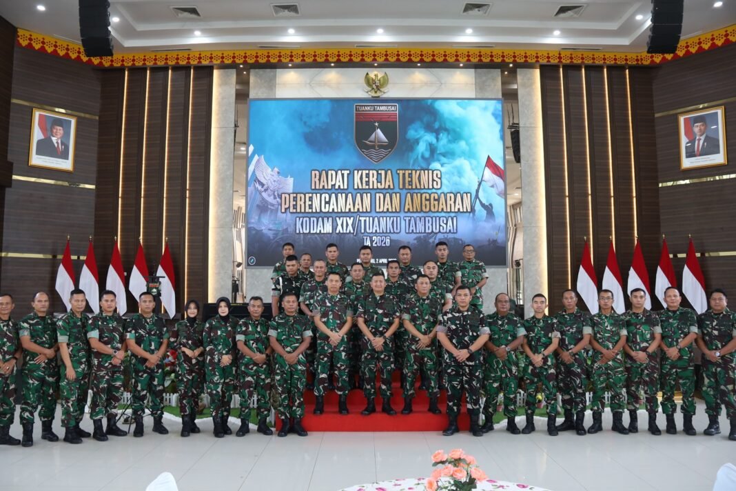 PEKANBARU || Kodam XIX/Tuanku Tambusai telah mengadakan Rapat Kerja Teknis di bidang Perencanaan dan Anggaran yang berlangsung secara teratur dan penuh keseriusan. Acara ini dibuka secara resmi oleh Kolonel Arh Antonius Andre Wira K., S.AP., M.Si., selaku Asisten Perencanaan Kodam XIX/Tuanku Tambusai, dihadiri oleh seluruh pejabat yang bertanggung jawab dalam perencanaan satuan kerja (Satker) serta pengelolaan perbendaharaan di lingkungan Kodam, pada Kamis, 2 April 2026.