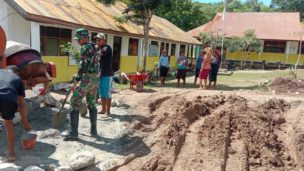 Pekerjaan dimulai dengan pengerjaan pondasi bangunan, melibatkan semangat gotong royong antara Personel Babinsa dan masyarakat setempat. Terlihat di lokasi, Serka Lamberto Da Costa berkolaborasi dengan warga untuk menyelesaikan pekerjaan secara efisien, meskipun kondisi geografis yang cukup menantang.