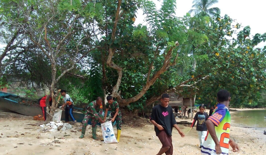 Kaimana – Dalam upaya meningkatkan kebersihan lingkungan, Satgas TMMD 127 Kodim 1804/Kaimana berkolaborasi dengan anggota TNI AL mengadakan aksi gotong royong pembersihan pantai di Kampung Sisir pada tanggal 28 Februari 2026.