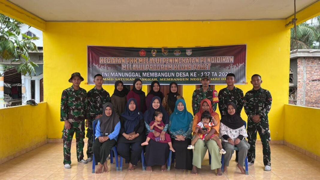 Banyuasin – Anggota Satgas TNI Manunggal Membangun Desa (TMMD) ke-127 dari Kodim 0430/Banyuasin berkolaborasi dengan Tim Penggerak PKK Desa Wonosari melaksanakan kegiatan peningkatan pendidikan bagi masyarakat. Kegiatan ini berlangsung di Desa Wonosari, Kecamatan Pulau Rimau, Kabupaten Banyuasin.