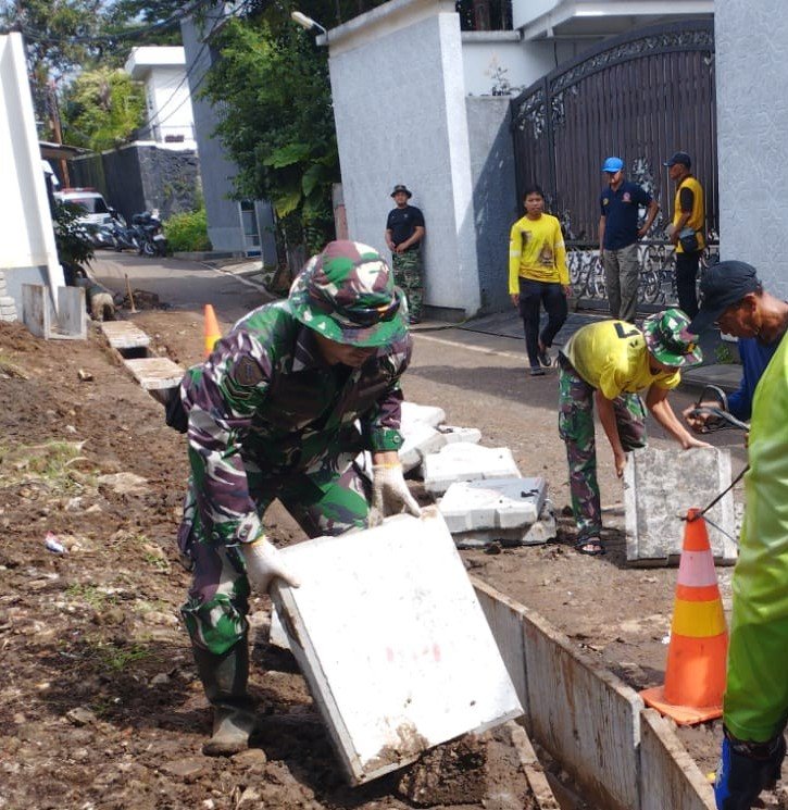 Depok – Memasuki hari ke-25 pelaksanaan program TNI Manunggal Membangun Desa (TMMD) Ke-127 Tahun Anggaran 2026, personel dari Kodim 0508/Depok terus memperkuat komitmennya dalam mempercepat pembangunan infrastruktur di Kelurahan Sukamaju, Kecamatan Cilodong, Kota Depok. Pada Sabtu, 7 Maret 2026, fokus kegiatan diarahkan pada penyelesaian pembuatan drainase selebar 200 meter di Jalan Bojong Lio, RT 03/28. Hingga saat ini, progres pemasangan ujung saluran berukuran 30 x 40 cm tersebut tercatat telah mencapai 95 persen. Meskipun cuaca di lokasi terlihat kurang mendukung dengan langit mendung dan hujan yang mengguyur dari siang hingga sore, semangat anggota Satgas TMMD dan warga setempat tetap tinggi. Mereka bekerja bahu-membahu untuk menyelesaikan tahap akhir agar saluran air dapat segera berfungsi dengan baik dan mencegah genangan di pemukiman. “Capaian 95 persen ini merupakan hasil kerja keras bersama. Kami optimis sasaran fisik di Jalan Bojong Lio ini akan rampung 100 persen dalam waktu dekat, sebelum penutupan kegiatan dilakukan,” ungkap perwakilan Satgas TMMD di lokasi. Pembangunan drainase ini diharapkan menjadi solusi jangka panjang, yang mendukung mobilitas dan kesehatan lingkungan warga RW 28 Kelurahan Sukamaju, khususnya selama musim penghujan ini.