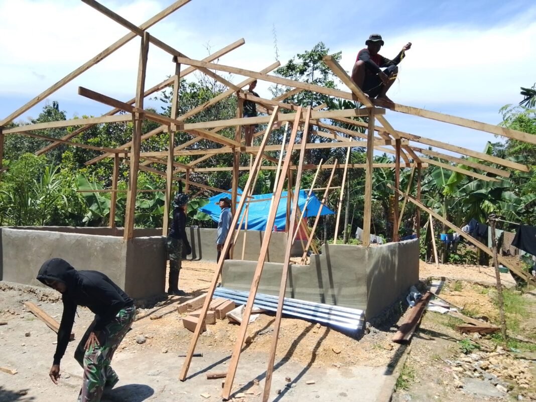 Para anggota Satgas TMMD tampak bekerja keras bersama warga setempat, melaksanakan berbagai tahapan pembangunan seperti pemasangan kerangka kayu pada bagian atas rumah hingga proses perapian atau pemeluran lantai. Semangat gotong royong ini bertujuan agar rumah yang sedang dibangun dapat segera diselesaikan dan dihuni oleh pemiliknya.