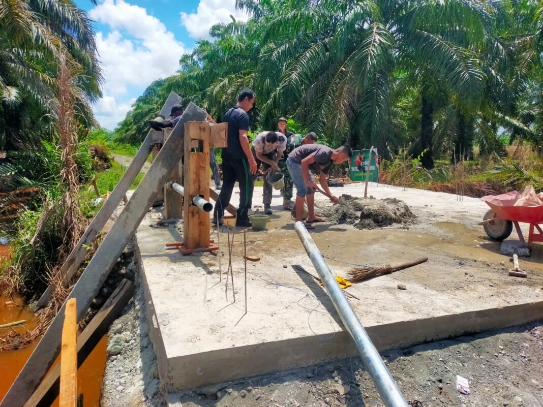 Nagan Raya – Personel Kodim 0116/Nagan Raya, lelaksanakan pengerjaan dan pembangunan jembatan di Desa Kuala Tripa, Tripa Makmur, Kabupaten Nagan Raya, Jumat (10/04/2026).