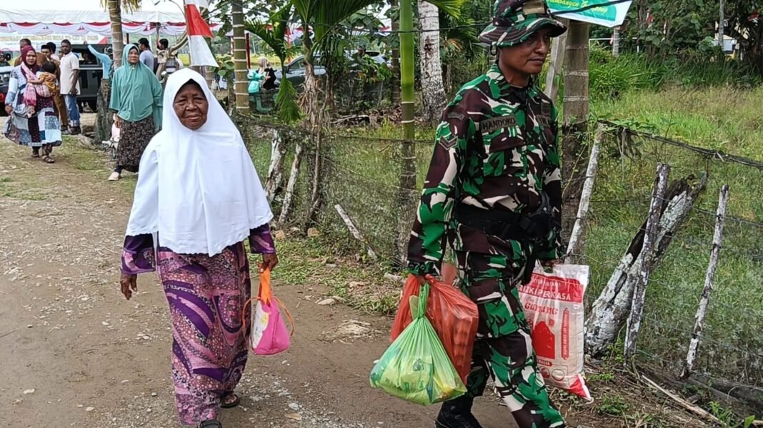 Di tengah keramaian, prajurit TNI yang tergabung dalam Satgas TMMD tampak aktif membantu warga. Dengan penuh kehangatan, mereka membantu mengatur kegiatan dan bahkan membantu warga membawa sembako yang telah dibeli.