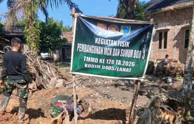 Lahat — Satgas TNI Manunggal Membangun Desa (TMMD) ke-128 Kodim 0405/Lahat menunjukkan kecepatan bertindak yang mengesankan dalam menyediakan fasilitas bagi warga. Setelah berhasil menemukan sumber air bersih lewat pengeboran, pembangunan sarana mandi, cuci, kakus (MCK) segera dimulai di Desa Lubuk Tampang, Kecamatan Kikim Timur, Kabupaten Lahat.