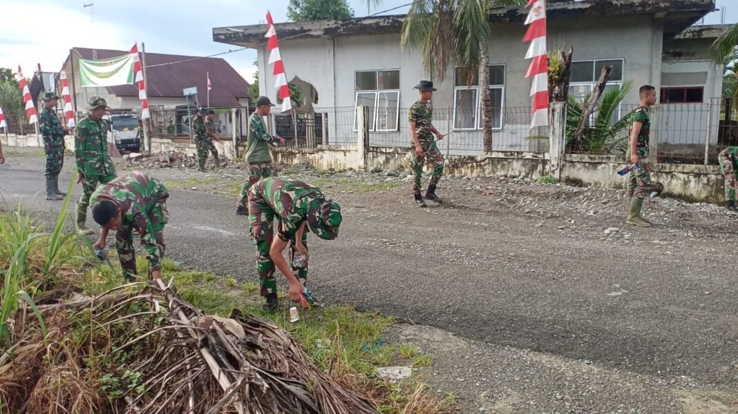 Meski memasuki hari Minggu, para prajurit tetap aktif melaksanakan pembersihan lingkungan di sekitar Pos Komando Taktis (Kotis) di Desa Ujong Blang, Kecamatan Beutong, Minggu (15/2/2026).