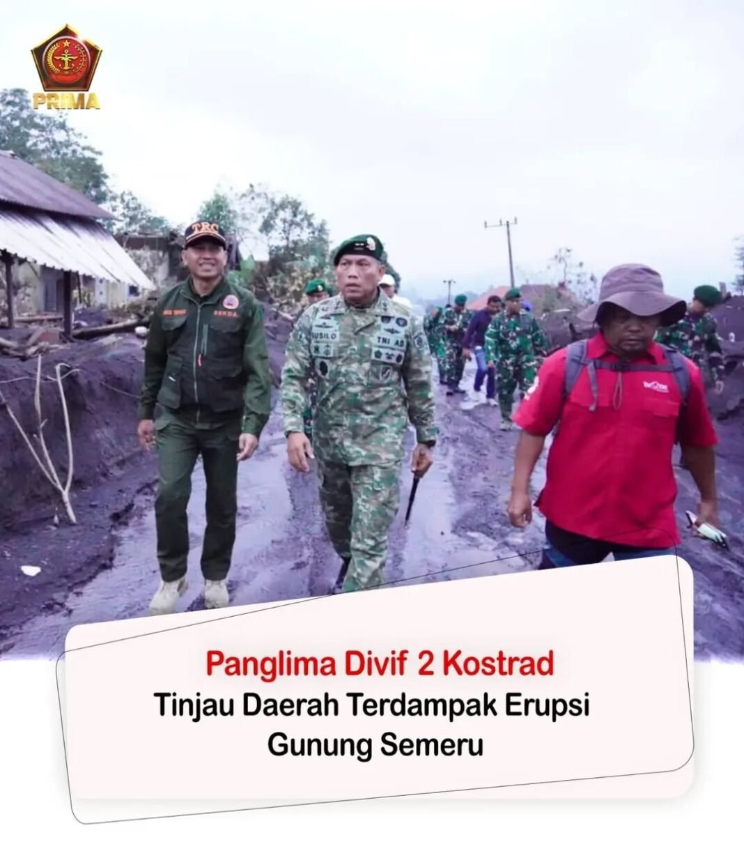 Panglima Divisi Infanteri 2 Kostrad Mayjen TNI Susilo melaksanakan peninjauan langsung ke Desa Supiturang, Kecamatan Pronojiwo, Kabupaten Lumajang yang merupakan salah satu titik yang terdampak sangat parah akibat dari erupsi Gunung Semeru (23/11/2025)