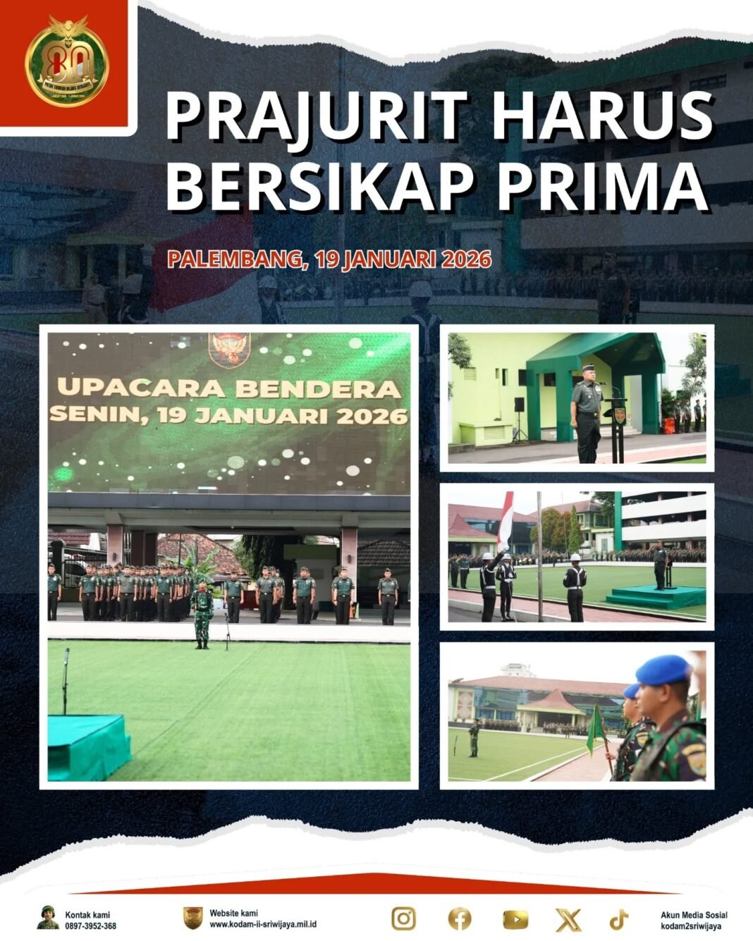 Pada hari Senin, 19 Januari 2026, prajurit dan pegawai negeri sipil (PNS) di lingkungan Markas Komando Daerah Militer II/Sriwijaya melaksanakan Upacara Bendera Bulanan dengan penuh khidmat. Upacara ini dipimpin oleh Inspektur Daerah Militer II/Sriwijaya, Brigjen TNI M. Fachmi Rizal Nasution, yang membacakan amanat Panglima TNI, Jenderal TNI Agus Subiyanto.