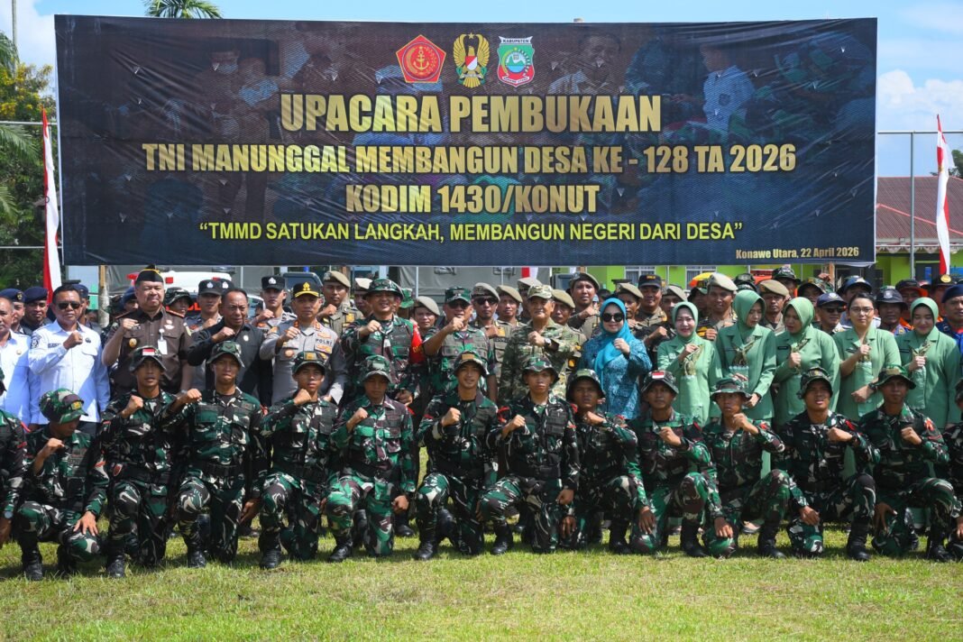 Konawe Utara – Program TNI Manunggal Membangun Desa (TMMD) ke-128 untuk Tahun Anggaran 2026 resmi dimulai dengan seremonial yang berlangsung di Lapangan Sepak Bola Apdasi, Kelurahan Andowia, Kecamatan Andowia, Kabupaten Konawe Utara, pada Rabu (22/4/2026) pukul 09.00 WITA. Kegiatan ini mengusung tema ‘TMMD Satukan Langkah Membangun Negeri dari Desa’ dan dihadiri oleh sekitar 300 orang peserta serta tamu undangan.