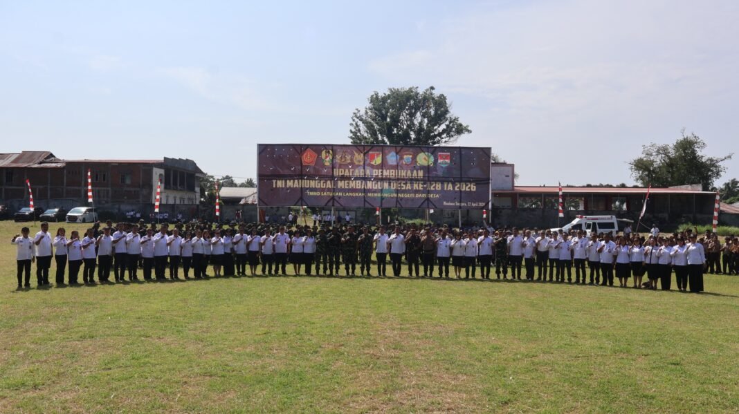 Minahasa Tenggara – Program Tentara Manunggal Masuk Desa (TMMD) ke-128 resmi dibuka oleh Kodim 1302/Minahasa di Desa Tababo Selatan, Kecamatan Belang, pada Rabu, 22 April 2026, pukul 08.40 WITA. Acara tersebut menggambarkan kebersamaan TNI dan masyarakat yang terlihat jelas di Lapangan Sepak Bola Glora, yang dipadati oleh peserta dari berbagai elemen, termasuk prajurit TNI-Polri, aparatur pemerintah, dan masyarakat setempat, yang semuanya berkumpul dengan satu tujuan: membangun desa.
