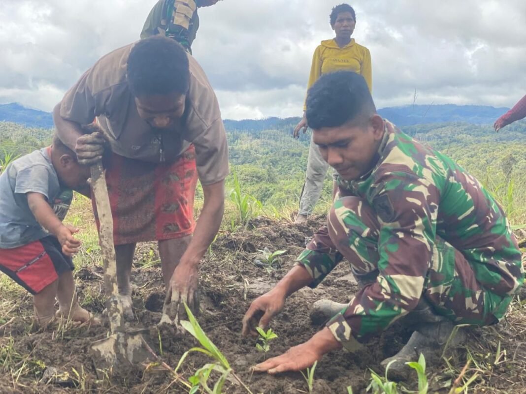 Dalam kegiatan tersebut, anggota Pos Parim terlibat langsung bersama warga dalam menanam bibit kopi di lahan yang telah disiapkan. Selain memberikan pengetahuan mengenai metode penanaman, para prajurit pun mendampingi masyarakat secara praktik, bertujuan agar bibit dapat tumbuh optimal dan memberikan hasil yang bermanfaat ke depan.