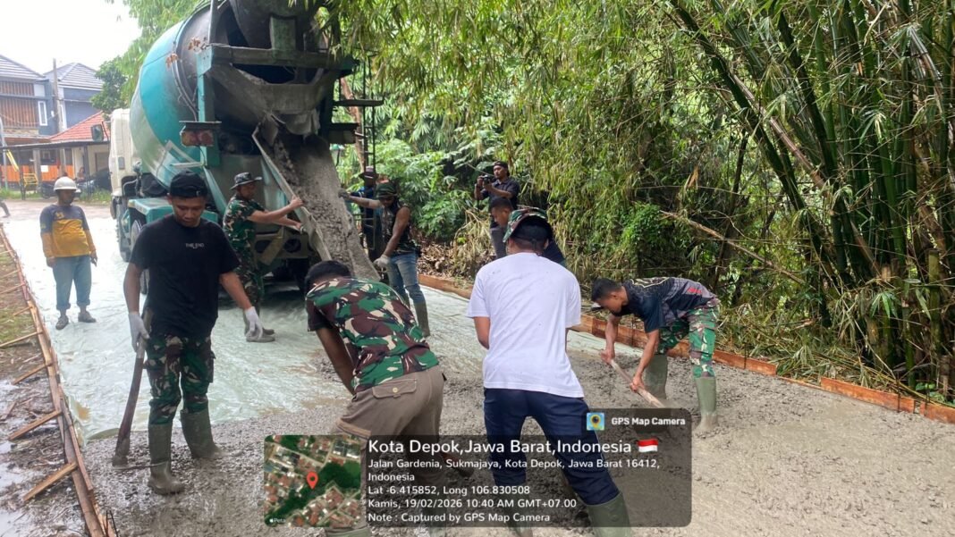 Depok – Pelaksanaan TNI Manunggal Membangun Desa (TMMD) Ke-127 Tahun Anggaran 2026 yang dilaksanakan oleh Kodim 0508/Depok menunjukkan kemajuan yang menggembirakan. Pada hari ke-9 (H+9) yang jatuh pada Kamis, 19 Februari 2026, pengerasan jalan di kawasan GDC Sektor Gardenia Blok Q RT 03/07, Kelurahan Tirtajaya, Kecamatan Sukmajaya, Kota Depok, telah mencapai progres sebesar 44 persen.
