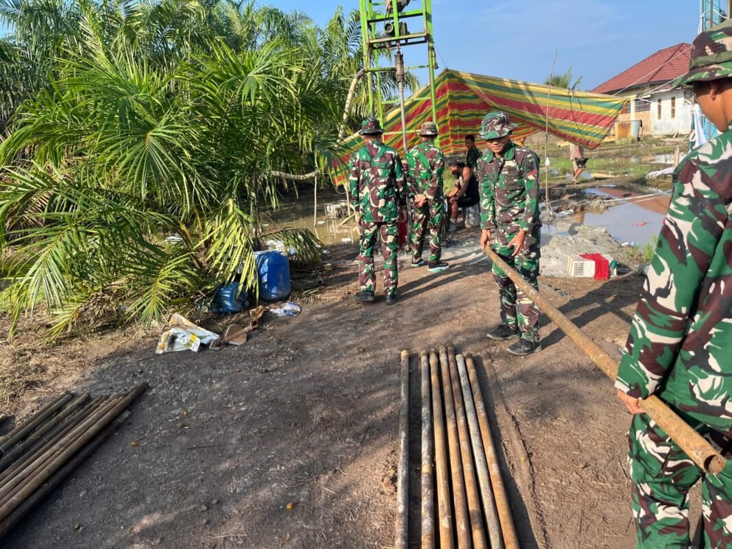 Banyuasin – Anggota Satgas TNI Manunggal Membangun Desa (TMMD) ke-127 dari Kodim 0430/Banyuasin bekerja sama dengan masyarakat setempat untuk mempercepat proses pembangunan sumur bor ketiga. Sumur bor ini terletak di belakang Kantor Desa Wonosari, Kecamatan Pulau Rimau, Kabupaten Banyuasin.