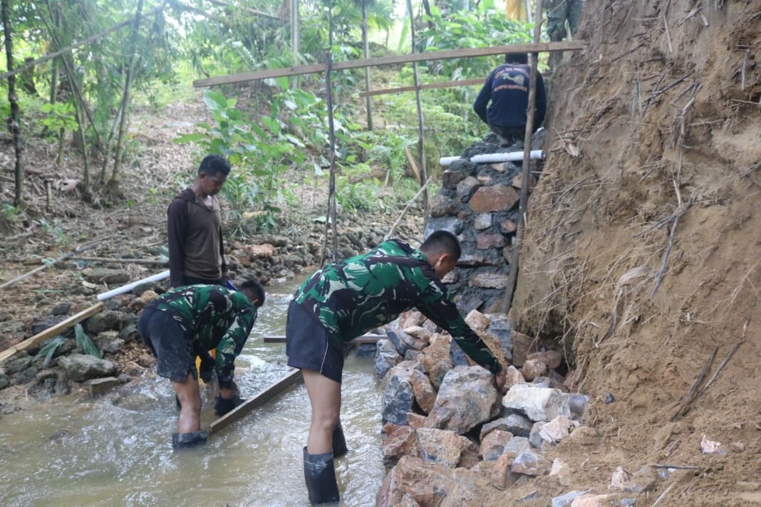 KENDARI – Di bawah sinar matahari yang menyengat, anggota Satgas TMMD ke-127 dari Kodim 1417/Kendari terus mempercepat pengerjaan talud di Kelurahan Anggoeya pada Rabu (4/3). Setiap batu yang disusun diletakkan dengan penuh kehati-hatian untuk membangun tembok penahan tanah yang kuat. Talud ini dirancang khusus untuk memberikan perlindungan kepada pemukiman warga terhadap risiko abrasi dan kemungkinan longsor, terutama selama musim hujan.