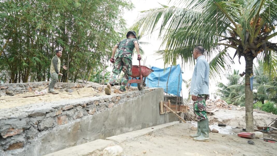 Anggota TNI terlihat bekerja dengan kekompakan, mulai dari mengangkut material hingga meratakan adukan beton, meskipun kondisi lapangan yang cukup menantang.