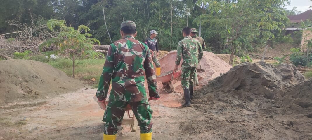 Para prajurit bekerja sama dengan masyarakat setempat terlihat saling bantu dalam mengangkut material seperti semen dan pasir secara manual, demi kelancaran proses plesteran dinding talud. Upaya ini dilakukan untuk memastikan kekuatan struktur bangunan dalam menghadapi beban tanah dan perubahan cuaca.