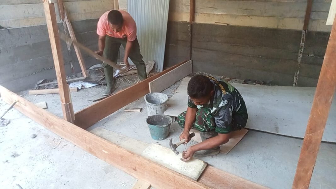 Di tengah semangat kebersamaan, personel Satgas bersama masyarakat bahu-membahu merangkai tiang demi tiang balok kayu. Ketukan palu yang beradu dengan paku terdengar tiada henti, menandai proses berdirinya rangka bangunan yang kelak menjadi tempat tinggal layak huni bagi warga penerima manfaat.