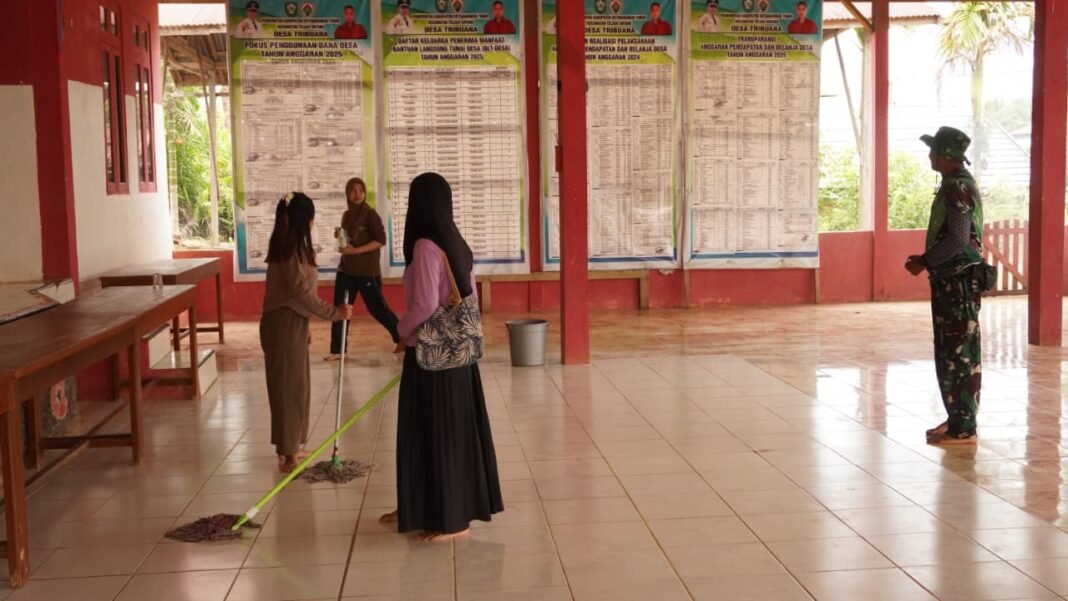 Kotawaringin Timur – Anggota Satgas TMMD Reguler ke-127 Kodim 1015/Sampit berkolaborasi dengan warga setempat untuk menyiapkan Aula Kantor Desa Tribuana, Kecamatan Antang Kalang, Kabupaten Kotawaringin Timur, sebagai lokasi kegiatan sunat massal. Kegiatan ini berlangsung pada Kamis, 12 Februari 2026, dalam rangka mendukung pelaksanaan program sosial tersebut.