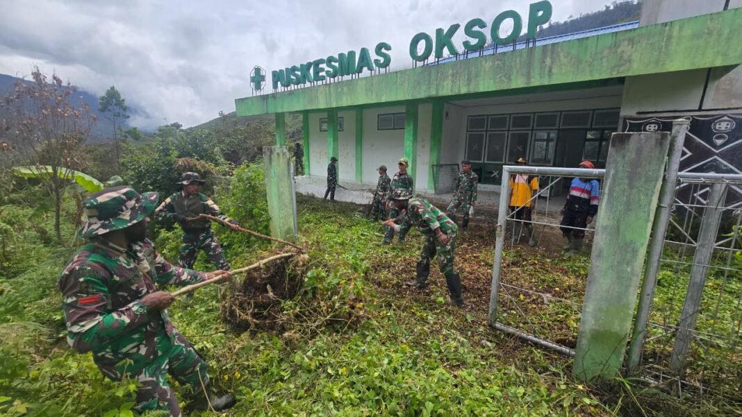 Satgas Yonif 751/VJS Lakukan Karya Bakti Pembersihan Puskesmas Oksop untuk Layanan Kesehatan