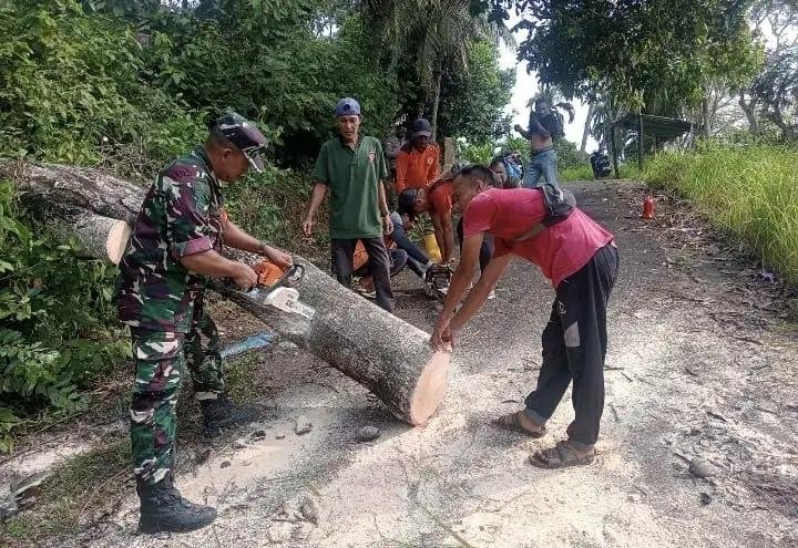Mendapat informasi tersebut, Babinsa Koramil 02/Sukakarya segera bergerak cepat menuju lokasi. Bersama warga setempat dan petugas Badan Penanggulangan Bencana Daerah (BPBD), Babinsa langsung melakukan upaya penanganan dengan membersihkan pohon yang menutup jalan.