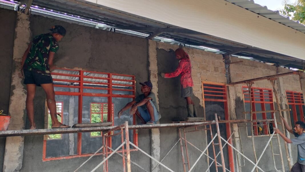 Kefamenanu, NTT – Suasana antusiasme terlihat jelas di Desa Sunkaen pada Jumat (27/02/2026), saat Satgas TMMD Ke-127 dari Kodim 1618/TTU melanjutkan proses plester dinding luar empat ruang kelas baru (RKB) di SMAN Bikomi Nilulat. Proses ini merupakan langkah penting dalam penyempurnaan struktur bangunan sekolah.