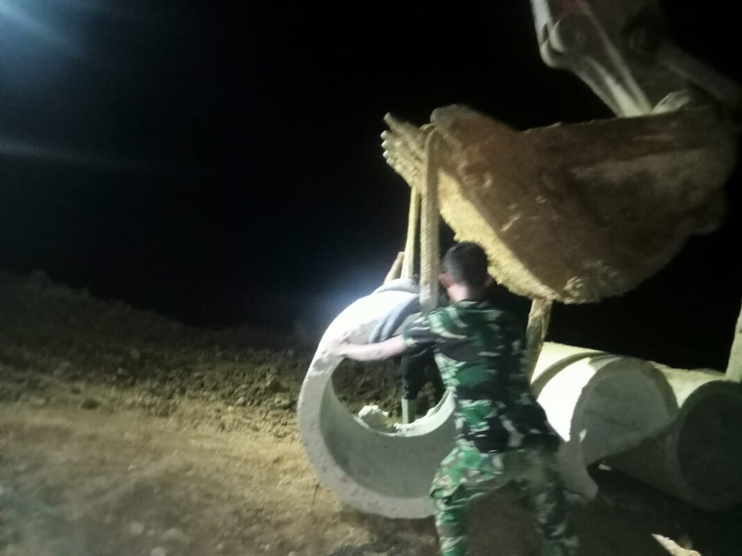 Kegiatan yang berlangsung di bawah udara malam yang dingin tersebut menjadi bagian dari upaya percepatan penyelesaian program TMMD sebelum penutupan kegiatan digelar. Para prajurit terlihat bekerja bersama-sama memindahkan gorong-gorong dengan memanfaatkan tali tambang besar yang dikendalikan secara manual oleh anggota satgas.
