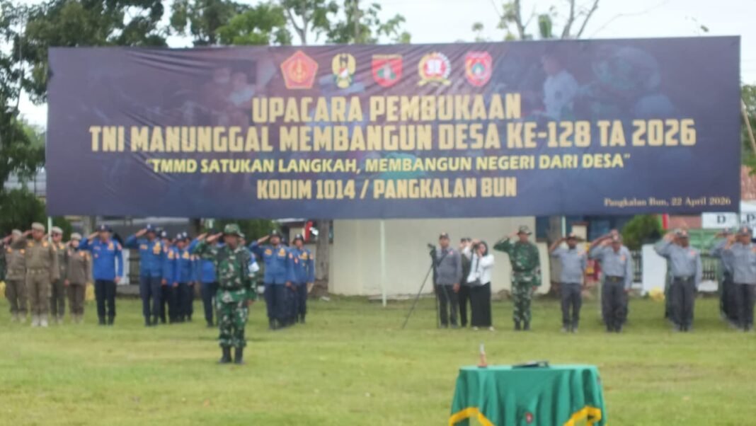 Pangkalan Banteng – Program TNI Manunggal Membangun Desa (TMMD) Ke-128 yang digagas oleh Kodim 1014/Pangkalan Bun resmi dibuka melalui sebuah upacara di Kecamatan Pangkalan Banteng, Kabupaten Kotawaringin Barat, pada Rabu (22/4/2026). Upacara ini menjadi tanda dimulainya inisiatif yang bertujuan mempercepat pembangunan serta pemberdayaan masyarakat di wilayah pedesaan.