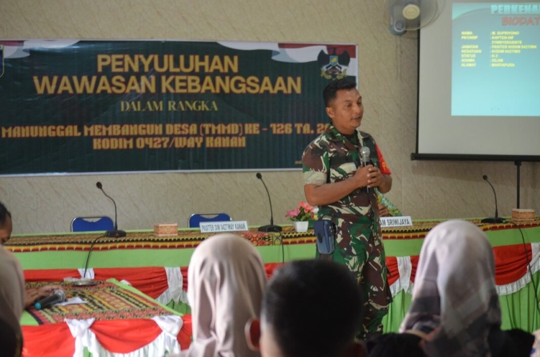 Way Kanan – Dalam rangkaian kegiatan non-fisik TNI Manunggal Membangun Desa (TMMD) ke-126 Tahun 2025, Kodim 0427/Way Kanan menggelar penyuluhan Wawasan Kebangsaan di Balai Kampung Sriwijaya, Jumat (10/10/2025). Kegiatan ini diikuti oleh 40 warga setempat dengan antusias tinggi.