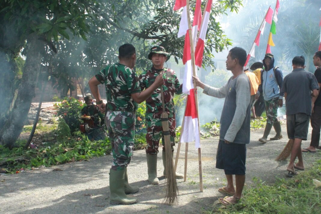 Sejumlah anggota Satgas TMMD bersama warga setempat terlihat memasang umbul-umbul di sepanjang jalan desa, Selasa (10/3/2026). Kegiatan itu dilakukan sebagai bagian dari persiapan menyambut upacara penutupan TMMD yang dijadwalkan berlangsung pada Rabu, 11 Maret 2026 di Desa Keude Seumot.