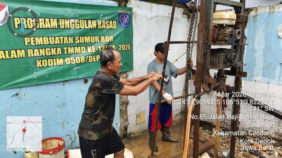 Depok – Memasuki hari ke-27 pelaksanaan TMMD Ke-127 TA. 2026, Kodim 0508/Depok telah mencapai keberhasilan dalam program unggulan TNI Angkatan Darat yang berfokus pada penyediaan fasilitas air bersih. Pada Senin, 9 Maret 2026, pembuatan sumur bor di Posyandu Mekarsari dinyatakan telah rampung 100%.