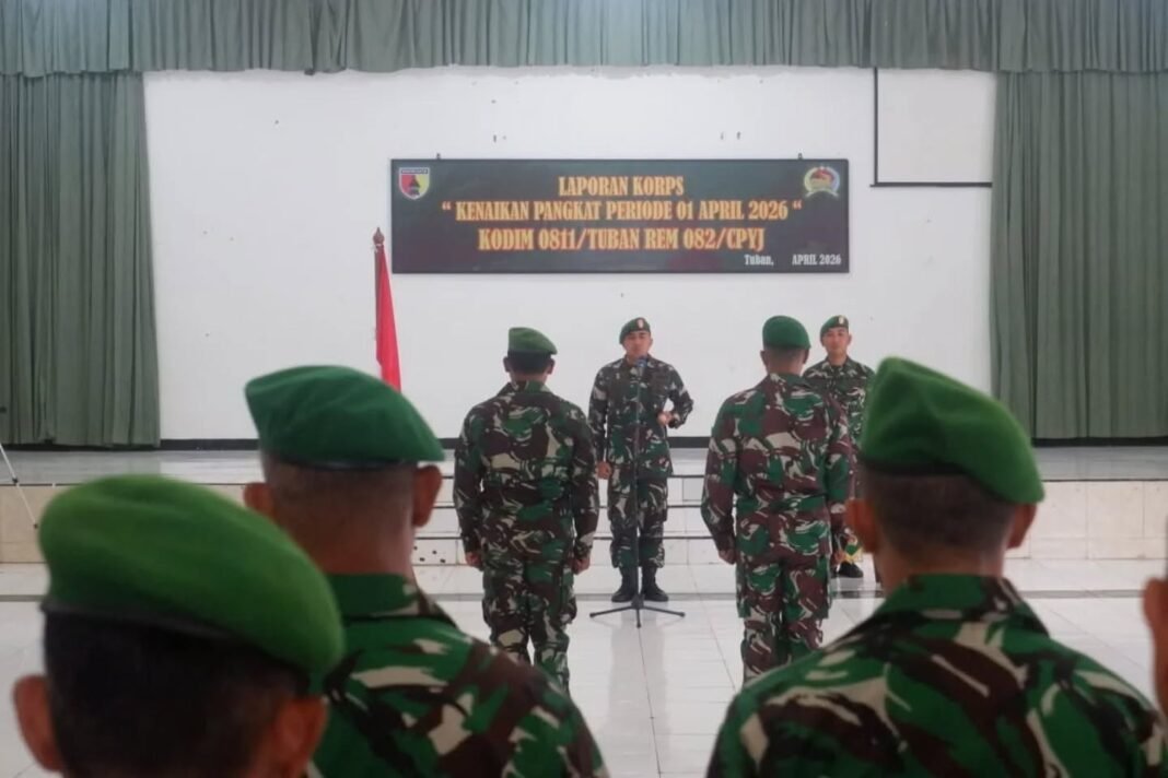 TUBAN – Letkol Inf Galih Sakti Pramudyo, S.M., M.M., yang menjabat sebagai Komandan Kodim 0811/Tuban, memimpin upacara Korps Raport Kenaikan Pangkat untuk personel Perwira, Bintara, dan Tamtama pada 1 April 2026. Kegiatan ini berlangsung di Gedung Letda Sucipto, Makodim 0811/Tuban, dengan penuh khidmat dan rasa bangga dari seluruh peserta yang hadir.